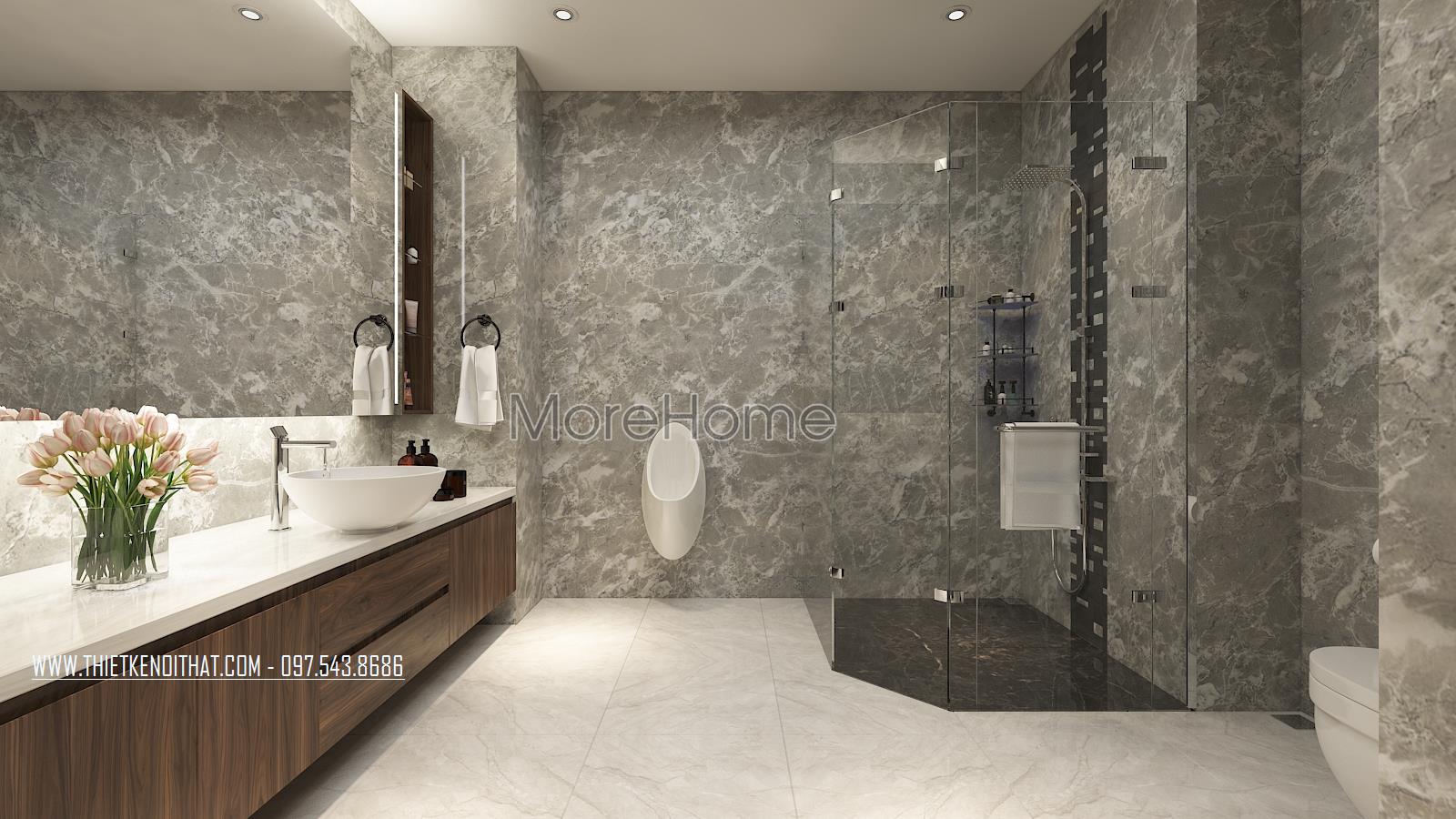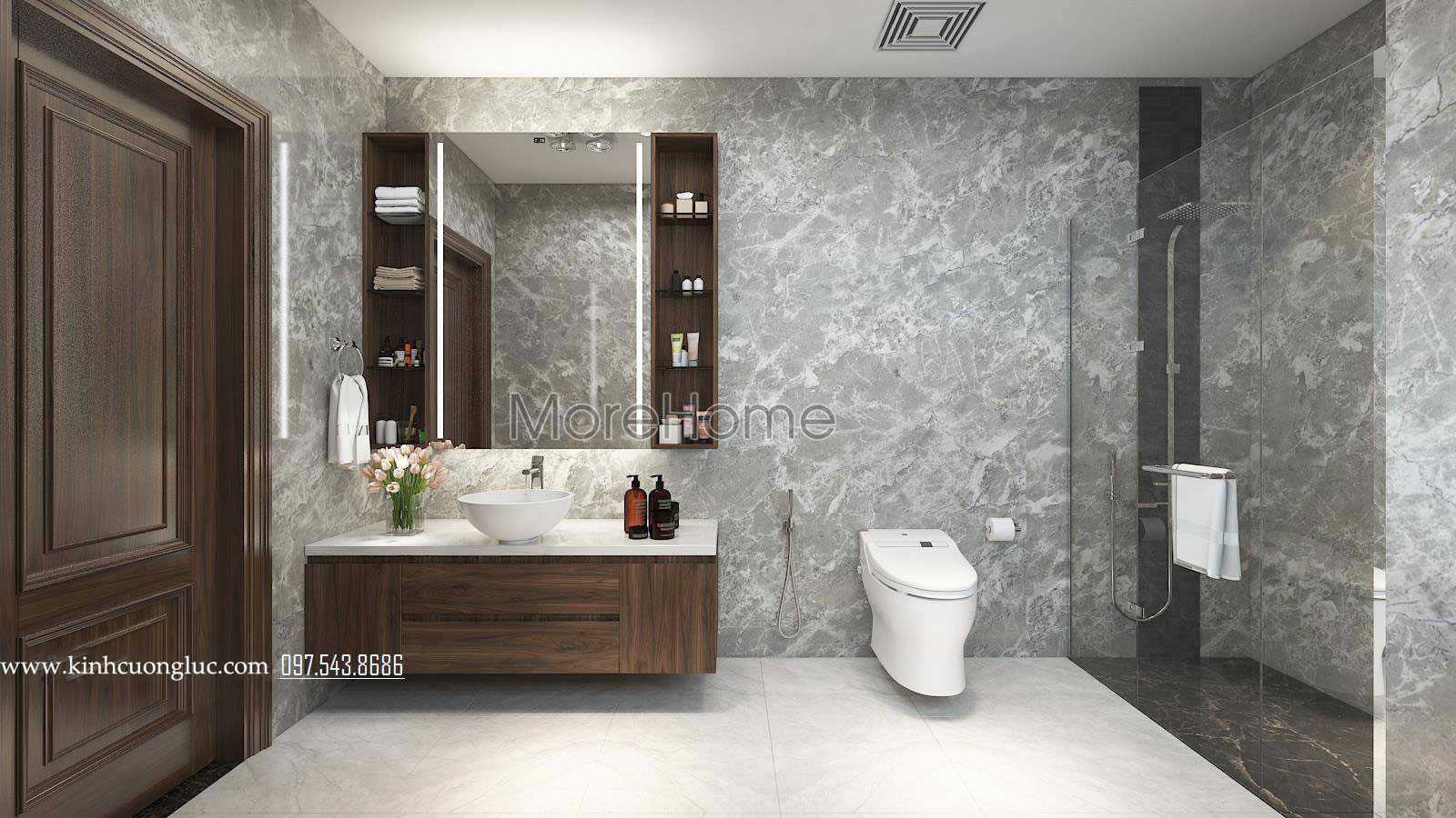Thiết kế vách kính tắm nhà lô phố Maison Du Park, MOREGLASS lựa chọn vách kính cường lực 135 độ nhằm lựa chọn góc phòng tắm vừa đẹp thẩm mỹ lại tạo cảm giác thỏa mái, tự nhiên nhất cho gia chủ.