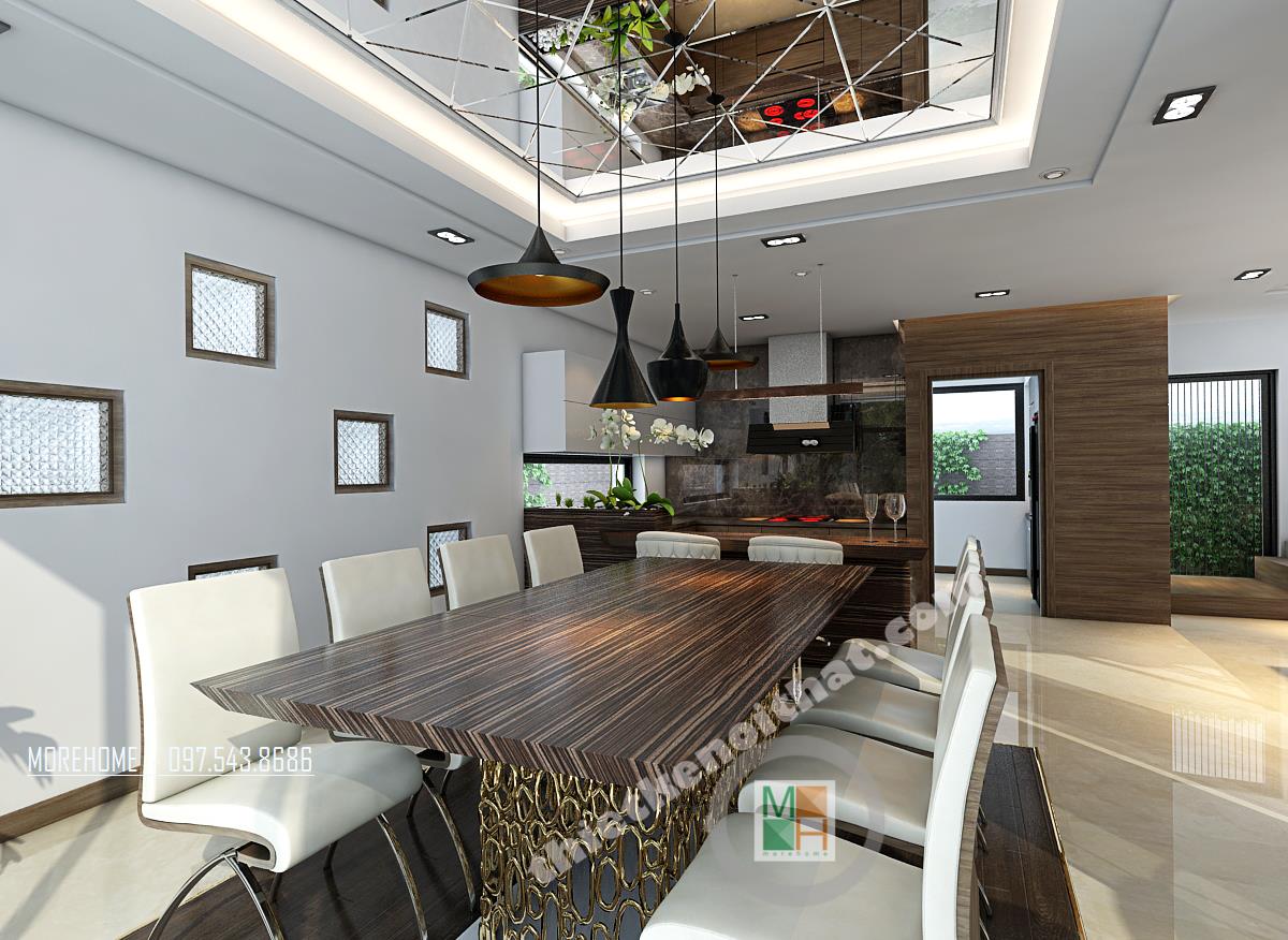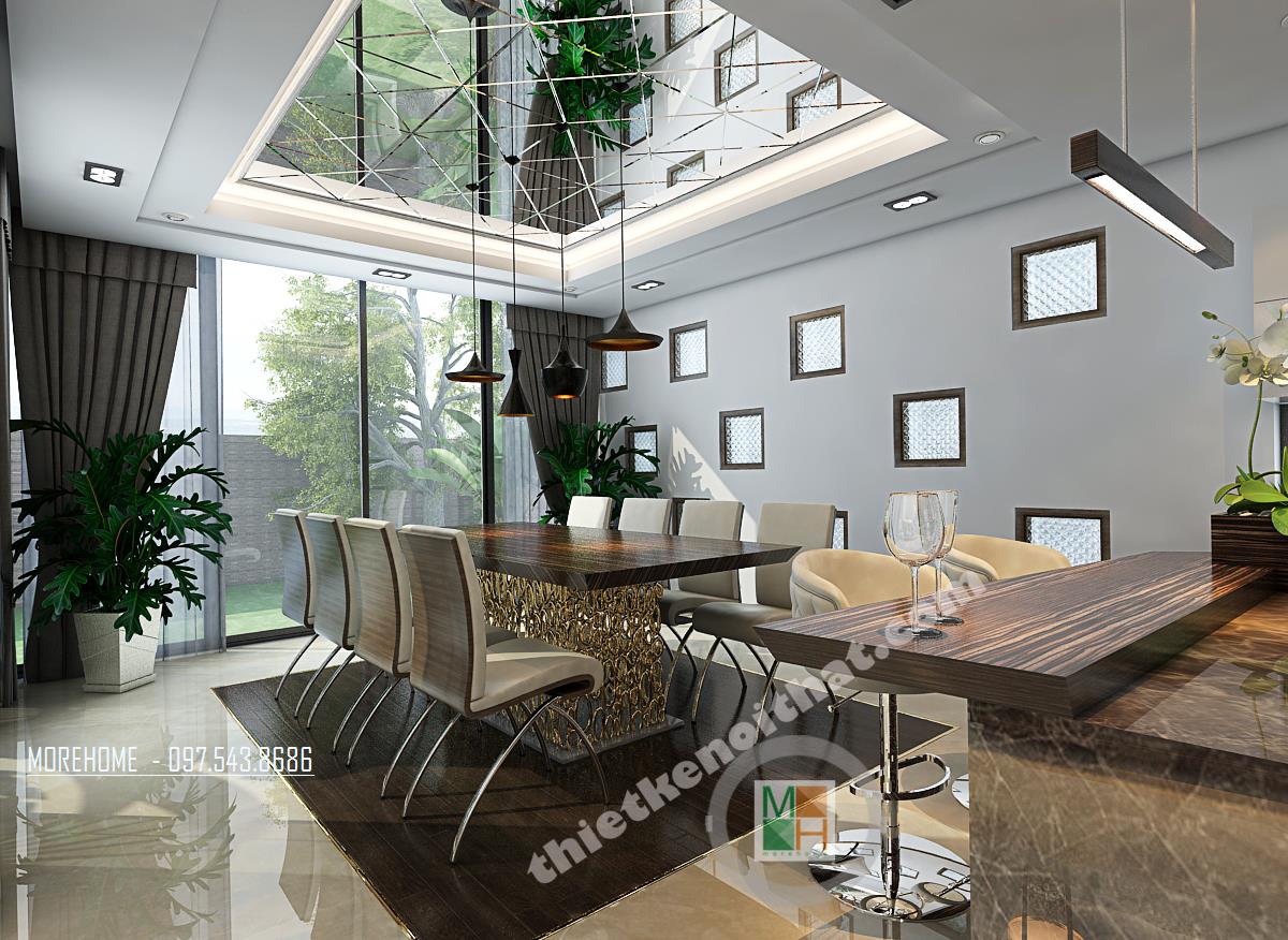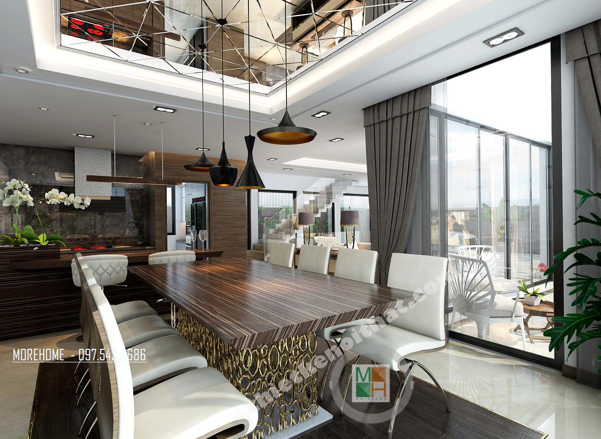 Trần gương ốp biệt thự với thiết kế gương tấm ghép quả trám giúp nhân đôi không gian. Thiết kế gương ốp trần rất dễ áp dụng, thực hiện được nhiều không gian, đặc biệt biệt thự phong cách hiện đại sang trọng như thế này.
